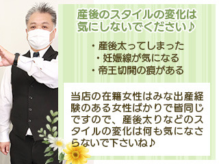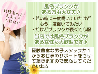 若くないし大丈夫かなと心配される方も少なくありません。女性目線で考えると『男性は結局若い子がいいんでしょ!?』と思いがち。しかし、R30・R40の代にも需要があるからこそ私共は募集をしています。自分に自信がない・妊娠線や体型の崩れなど本人にとっては悩みかもしれませんが当店はあなたのコンプレックスも含めて応募してきて貰いたいのです。そんなコンプレックスがあっても稼がせてみせます!!