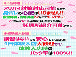 | 特典 | ★体験入店時バック率100%☆業務拡大につき激熱イベント実施中! 当店では入店から3日間はバック率100%☆ ☆完全全額日払 お給料のごまかしや、別日との分割払い、諸経費という名目での天引きなどは一切ございません。 また、ノルマやそれに伴う罰金なども一切なく、稼いだ分はその日に全てお持ち帰り頂けます。 ☆完全自由出勤制 ご自身のご都合に合わせて出勤日や時間を決めて頂き、お店に申告して頂くシステムをとっております。 急な体調不良やご家庭の事情による欠勤や遅刻、早退に関するペナルティは一切ありません。 ご自身の夢や目標に向かって、無理のないシフトをお立て下さい。 ☆新人保障制度 当店では初出勤当日から、会員様向けにメルマガの発行やお店のホームページや外部の風俗情報サイトでの告知、 更にはお客様からの問合せに対する売り込みなど、利用可能なあらゆる媒体を使用してプロモーションを行なう為、 「お仕事が1件もつかなかった・・・」、「お給料がゼロだった・・・」といった事はまずございません。 また、入店祝金制度もございます(当社規定あり)。頑張った方には、その分きっちりと反映されるシステムをとっております。 ☆個人情報の保護 当店は、在籍女性の個人情報の取り扱いに際して管理責任者を置き、適切かつ厳重な管理を行っております。 ☆風営法届出済 「無店舗型性風俗特殊営業」の届出を提出し、法律に準じたサービスで営業しております。 違法な面は一切ありません。 在籍している全ての女性に安心して働いて頂く為に、 法改正などの動きについて、いち早くキャッチして遵守徹底しています。 |